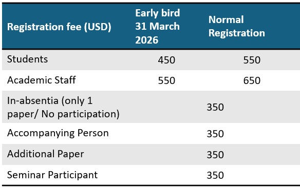 All presenting authors are required to pay the registration fee by June 15, 2026. Non-presenting participants must also complete their payments by this deadline, as on-site payments will not be permitted. Late payments after the conference will not be accepted, so please make sure to arrange your payment promptly.